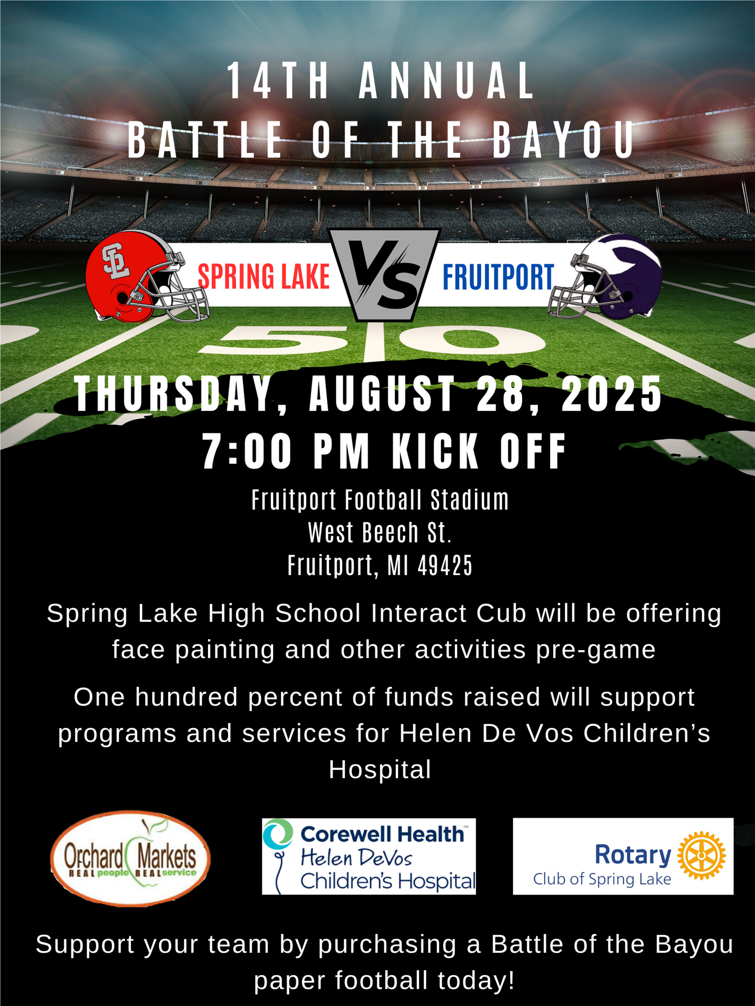 The annual Battle of the Bayou is Thursday, August 28th at Fruitport Football Stadium! This annual event is a friendly competition between two longtime football rivals - the Spring Lake Lakers vs the Fruitport Trojans. Leading up to the game, the Orchard Markets of Spring Lake and Fruitport are collecting donations. Stop at either store and add a donation to your grocery purchase at checkout. During the game on August 28th, members of the Spring Lake Rotary will be collecting donations in the stands - cash and Venmo accepted. Let's see which team's supporters will raise the most funds for Helen Devos Children's Hospital!